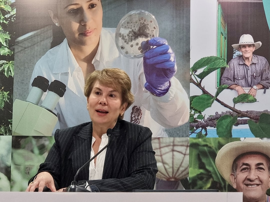 圖1/2 國際咖啡組織執行主任瓦努西亞·諾蓋拉於2025年8月26日在哥倫比亞波哥大一場活動中發言。路透社/路易斯·海梅·阿科斯塔