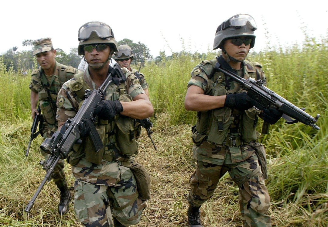 圖1/4:資料圖片。2003年8月30日,哥倫比亞軍隊士兵在瓜維亞雷省卡拉馬爾市郊巡邏。路透社/Daniel Muñoz