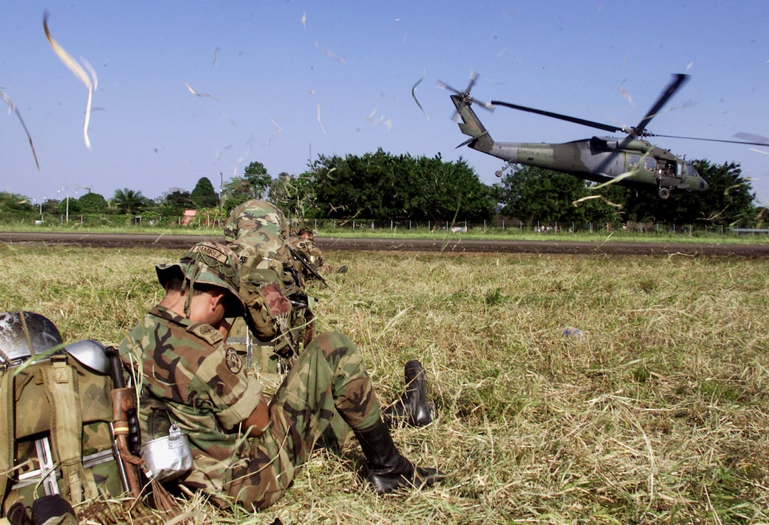 圖1/4:資料圖片。2003年8月30日,哥倫比亞軍隊士兵在瓜維亞雷省卡拉馬爾市郊巡邏。路透社/Daniel Muñoz