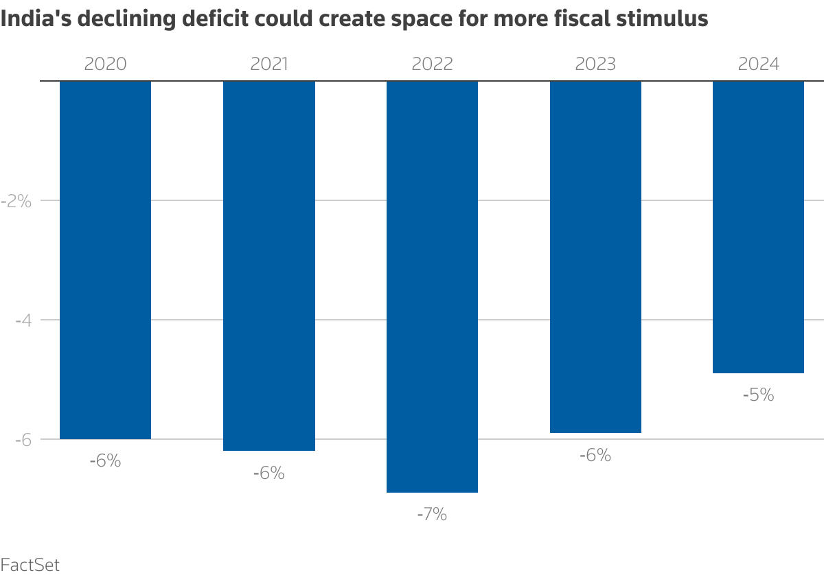 圖表展示了2020至2024年印度財政赤字佔GDP年度百分比。