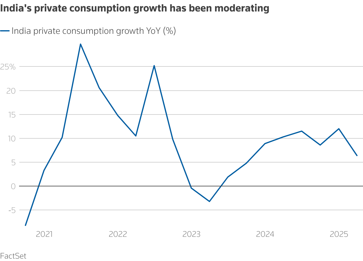 從2023年第四季度到2024年底,印度私人消費同比增長率在8.5%至12.0%之間徘徊,隨後在2025年第一季度放緩至6.4%。這種放緩趨勢預計在4-6月期間進一步加劇,多位經濟學家表示。7月份消費者價格通脹率驟降至1.55%的十年低點,同樣反映出國內消費疲軟。