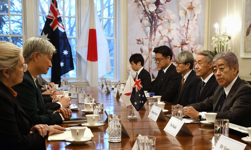 日本外相巖屋毅(右)與澳大利亞外長黃英賢週日於華盛頓舉行會談。圖:共同社