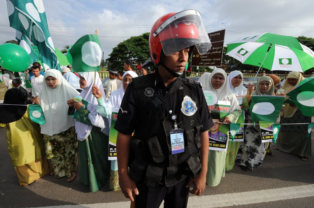 馬來西亞登嘉樓州投票站外,安保人員監視着馬來西亞伊斯蘭黨(PAS)支持者的集會。照片:法新社